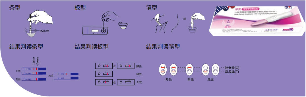條型1. 將尿液收集在干凈、干燥的尿杯中 ;2. 撕開密封包裝袋,取出試紙條,將試紙標有 MAX 的一端浸入尿液中 ( 液面不得超過試紙條箭頭下端的橫線 );3.1-5 分鐘觀察結果 (5 分鐘后結果無效 )。板型1. 收集尿液在干凈的尿杯中;2. 撕開密封包裝袋,取出檢測板和塑料吸管,并檢查試紙是否完好無損;3. 用塑料吸管將 3-4 滴尿液樣本滴入加樣孔(S) 中;4.1-5 分鐘內直接在結果顯示窗口觀察結果(5 分鐘后結果無效)。筆型1. 收集尿液在干凈的尿杯中;2. 撕開密封包裝袋,取出檢測筆,并檢查試紙是否完好無損 ;3. 拔下蓋子直接淋尿或從尿杯中吸取尿液至吸水棒全部濕透;4. 蓋上蓋子,窗口向上平放,1-5 分鐘內觀察結果 (5 分鐘后結果無效 )。