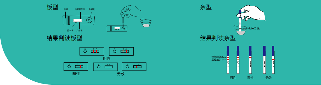 條型1. 收集尿液在干凈的尿杯中;2. 撕開密封包裝袋,取出試紙,并檢查試紙是否完好無損;3. 將試紙插入待測尿樣中,尿液界面勿超過試紙上 Max 線;4.1-3 分鐘觀察結(jié)果,5 分鐘后結(jié)果無效。板型1. 收集尿液在干凈的尿杯中;2. 撕開密封包裝袋,取出檢測板和塑料吸管,并檢查試紙是否完好無損;3. 用塑料吸管將 3-4 滴尿液樣本滴入加樣孔(S) 中;4.5 分鐘內(nèi)直接在結(jié)果顯示窗口中觀察結(jié)果。