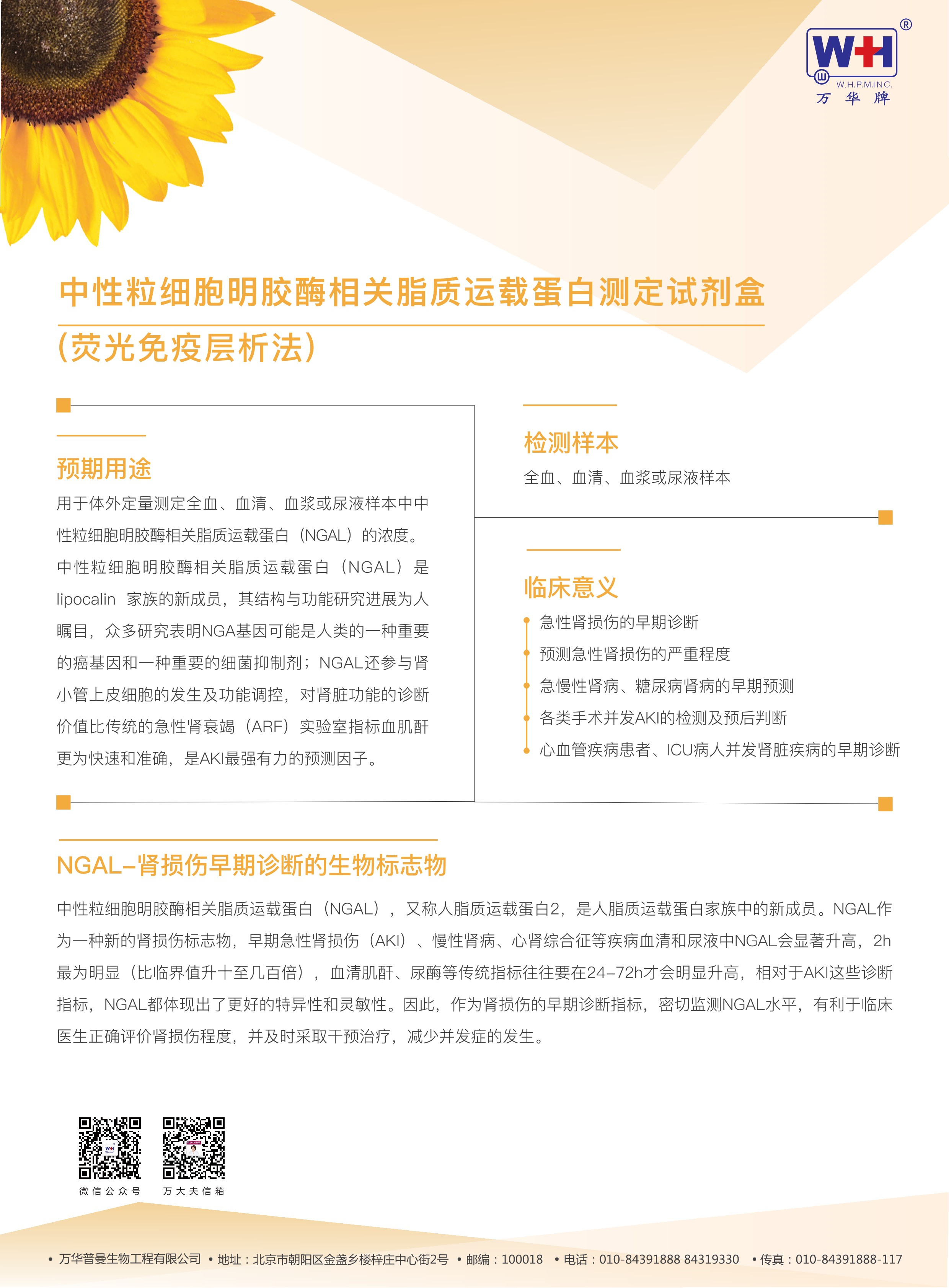 本試劑采用免疫熒光雙抗體夾心法。用于體外定量測定全血、血清、血漿或尿液樣本中中性粒細胞明膠酶相關脂質運載蛋白(NGAL)的濃度。中性粒細胞明膠酶相關脂質運載蛋白(NGAL)是 lipocalin 家族的新成員,其結構與功能研究進展為人矚目,眾多研究表明 NGA 基因可能是人類的一種重要的癌基因和一種重要的細菌抑制劑;NGAL 還參與腎小管上皮細胞的發生及功能調控,對腎臟功能的診斷價值比傳統的急性腎衰竭(ARF)實驗室指標血肌酐更為快速和準確,是 AKI 最強有力的預測因子。